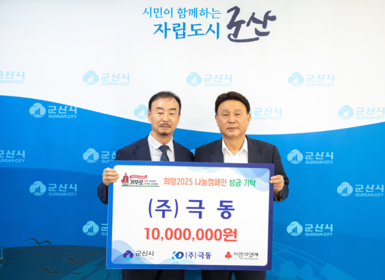 군산시는 ㈜극동(회장 오순영)이 군산시 사회복지시설 지원을 위한 성금으로 1,000만 원을 10일 기탁했다고 밝혔다. 이번에 전달된 성금은 전북사회복지공동모금회를 통해 군산시 가족센터 내 공동육아나눔터의 기능 보강 사업에 사용될 예정이며 본 후원은 지역사회의 돌봄공동체 환경을 조성하기 위한 의미 있는 기반이 될 것으로 기대된다.