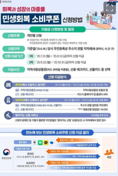 소비쿠폰은 1차(7월 21일~9월 12일), 2차(9월 22일~10월 31일) 두 차례에 걸쳐 신청 가능하며, 신청자는 본인의 상황에 따라 지역사랑상품권(모바일·지류형), 신용·체크카드 캐시백, 선불카드 중 지급 수단을 선택할 수 있다.