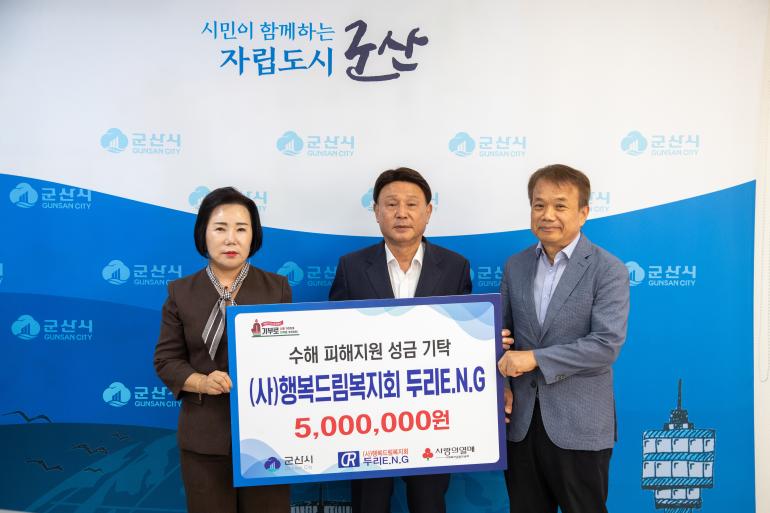 (사)행복드림복지회 두리 E.N.G(대표 김선례)가 수해로 피해를 입은 군산시 저소득 가구·사회복지시설의 신속한 복구를 위해 성금 500만 원을 기탁했다고 16일 밝혔다.