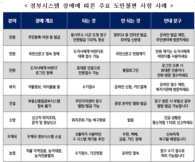 민생회복 소비쿠폰도 주민센터를 통한 오프라인 접수가 복구됐다. 안전 서비스 역시 큰 문제가 없다.