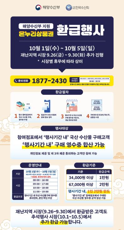 군산시가 추석을 앞두고 장바구니 물가 부담을 덜기 위해 농림축산식품부·해양수산부와 함께 ‘농축·수산물 온누리상품권 환급행사’를 10월 1일부터 5일까지 진행한다.