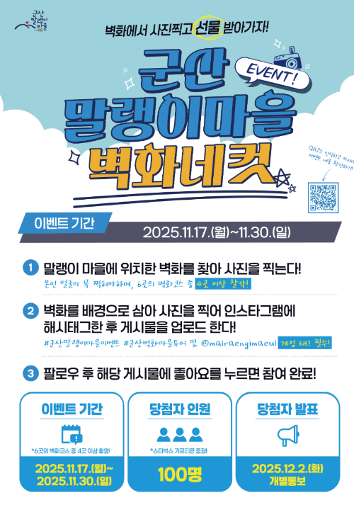 군산시가 오는 29일 열리는 ‘말랭이마을 골목잔치’를 앞두고 사전연계 홍보를 위해 ‘말랭이마을 벽화네컷’ 행사를 17일부터 30일까지 운영한다.이번 벽화네컷 행사는 골목잔치 분위기를 미리 끌어올리며 SNS를 통한 확산 기대감을 높이고 있다.