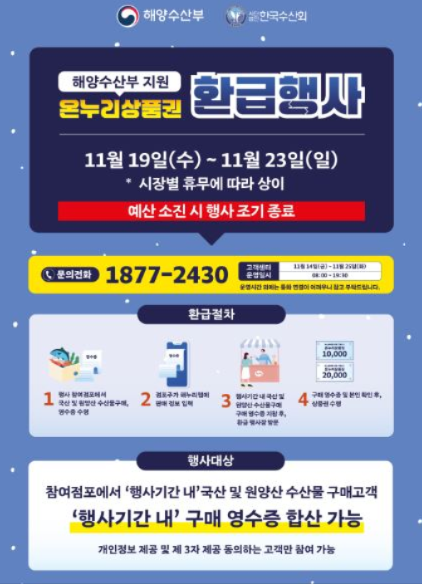 특히 김장철에는 젓갈류, 생선류 등 수산물 소비가 크게 늘어 가격 부담이 가중되는 시기인 만큼, 이번 환급행사가 시민들의 겨울철 식탁 준비에 실질적인 도움이 될 전망이다.