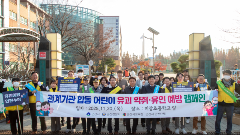군산시는 20일 미장초 등굣길에서 경찰서·교육지원청, 안전보안관 등과 함께 아동 유괴·유인 예방 캠페인을 진행했다.