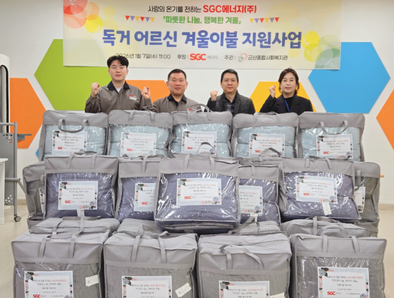 SGC에너지(주)는 지난 7일 군산종합사회복지관에서 방안용품 지원사업 '따뜻한 나눔, 행복한 겨울' 전달식을 열고 군산지역 취약계층 어르신들께 겨울이불을 전달했다.