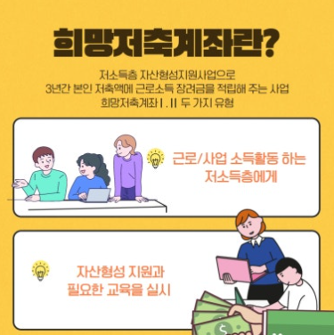 ‘희망저축계좌1’은 일하는 생계·의료 수급가구가 매월 10만원을 저축하면 근로소득장려금을 매칭 지원해 목돈 마련을 돕는 자산형성 지원사업이다. 3년간 근로활동을 유지하며 매월 10만원 이상을 저축할 경우, 매월 30만원씩(36개월) 적립되어 근로소득 장려금 1,080만원을 지원받을 수 있어 만기 시 최대 1,440만원과 이자를 수령하게 된다.