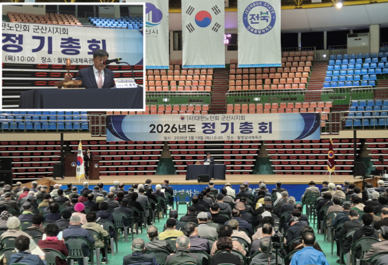 군산시노인회는 19일 군산월명체육관에서 대의원 556명이 참석한 가운데 ‘2026년도 정기총회’를 열고 2025년도 행정사무 감사보고와 주요업무 추진실적, 예산·결산 승인 안건을 비롯해 2026년도 주요업무 추진계획과 세입·세출 예산(안) 등을 심의·의결했다.