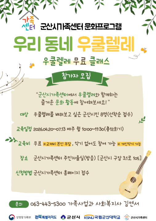 이에 따라 ‘우리동네 우쿨렐레’ 프로그램을 오는 4월 20일부터 7월 13일까지 운영하며, 매주 월요일 오전 10시 가족센터 2층 주민자율실에서 기초 코드와 연주 중심의 교육이 진행된다.