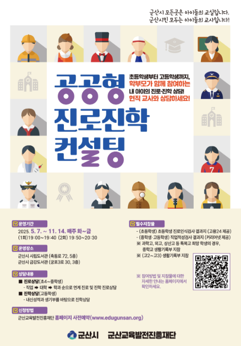참여 신청은 재단 누리집(www.edugunsan.org)을 통한 사전 예약으로 가능하다. 상담 시 초등학생은 고용 24에서 제공하는 ‘초등학생 진로 인식검사 결과지’를 중·고등학생은 커리어넷에서 제공하는 ‘직업적성검사 결과지’를 반드시 지참해야 한다.