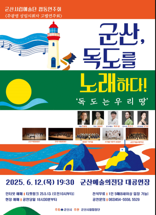 군산시립예술단이 오는 6월 12일 오후 7시 30분, 군산예술의전당 대공연장에서 합동 연주회 <군산, 독도를 노래하다>를 개최한다. 이번 연주회는 독도를 직접 방문한 시민들의 감동을 담은 시에 군산 출신 김삼곤 작곡가가 곡을 붙인 창작 음악으로 진행된다.
