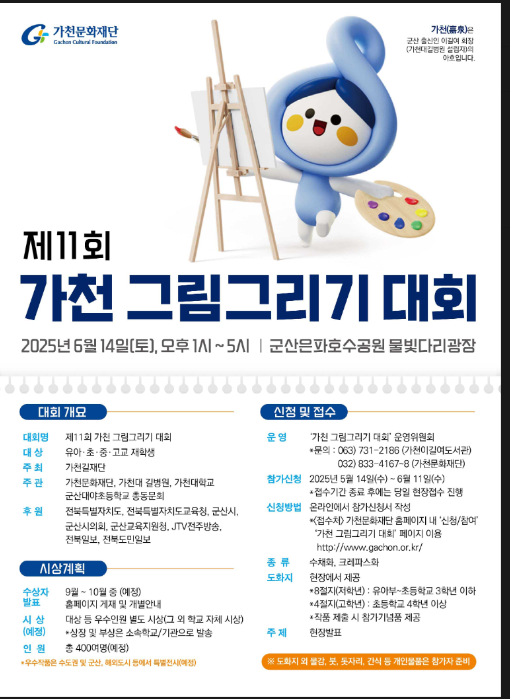 참가 신청은 5월 14일부터 6월 11일까지, 가천문화재단 누리집(www.gachon.or.kr)을 통해 온라인으로 접수하면 된다. 참가비는 무료이며, 도화지는 현장에서 제공, 물감·붓·크레파스·돗자리 등 개인 준비물만 챙기면 된다. 대회는 유아부, 초등 저·고학년, 중·고등부로 나뉘어 진행되며, 참가자 전원에게는 기념품이 증정된다.