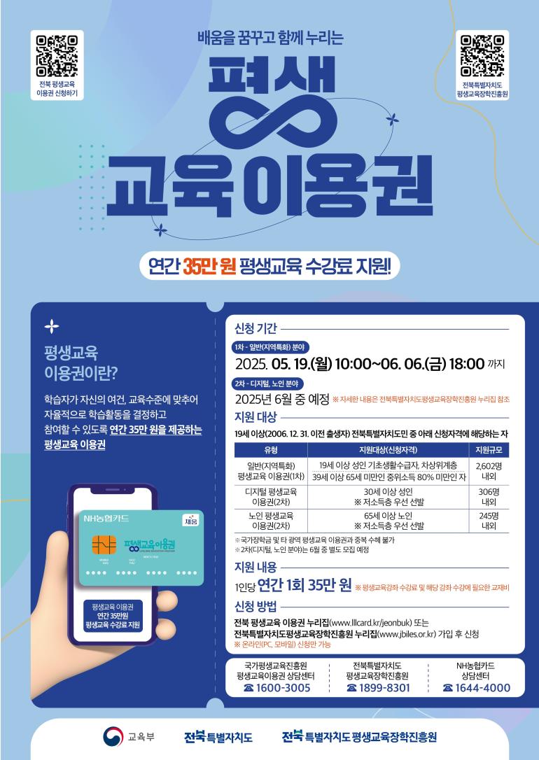 군산시는 ‘2025 전북특별자치도 평생교육 이용권’ 신청 접수를 오는 6일까지 진행한다. 이 사업은 경제적 여건으로 인해 평생학습 기회를 얻기 어려운 저소득층 성인을 대상으로 교육격차를 줄이고, 시민들의 자기 계발과 자아실현을 지원하기 위해 마련됐다.