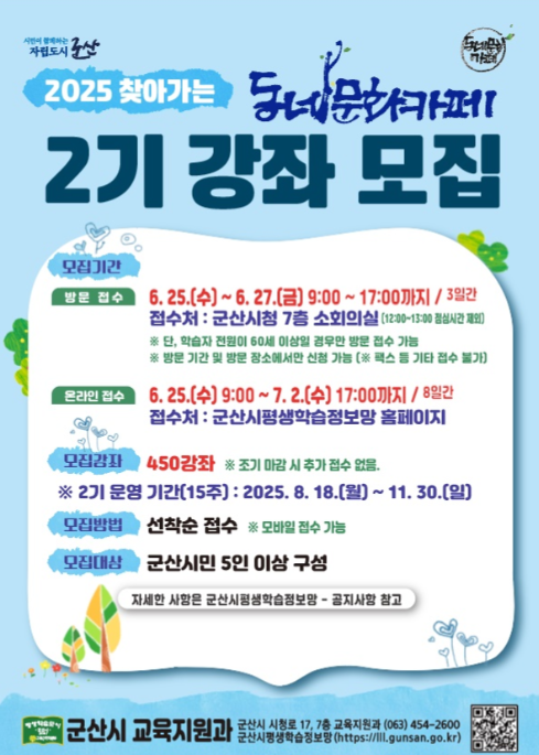 군산시는 오는 6월 25일부터 7월 2일까지 8일간 ‘찾아가는 동네문화카페 2기’에 참여할 강좌를 모집한다.