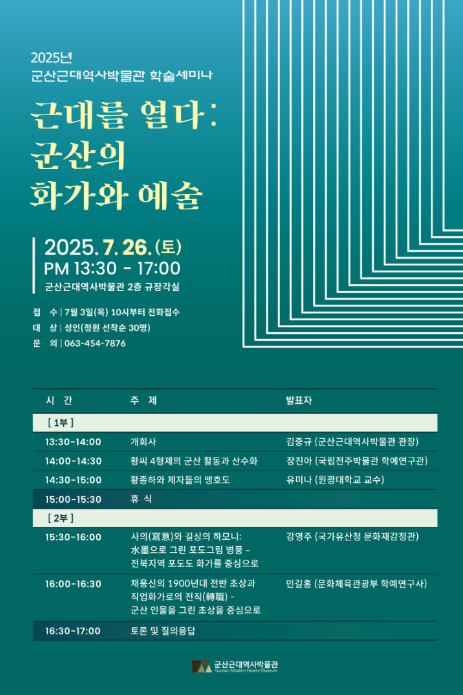 군산근대역사박물관 세미나는 대면 세미나로 26일 오후 1시 30분부터 5시까지 진행된다. 신청은 일반인 누구나 할 수 있으며, 4일 10시부터 전화접수가 가능하다 (063-454-7876). 정원은 선착순 30명이다.