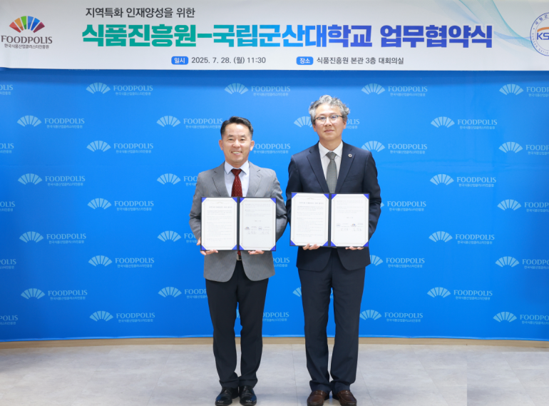국립군산대학교와 한국식품산업클러스터진흥원은 28일 식품 및 농생명·바이오 분야 산업 전문 인력 및 지역특화 인재 양성을 위한 업무 협약을 체결했다. 협약식에는 국립군산대학교 엄기욱 총장 직무대리, 산학협력단장 등을 비롯해 한국식품산업클러스터진흥원 김덕호 이사장 등 양측 관계자가 참석했다.
