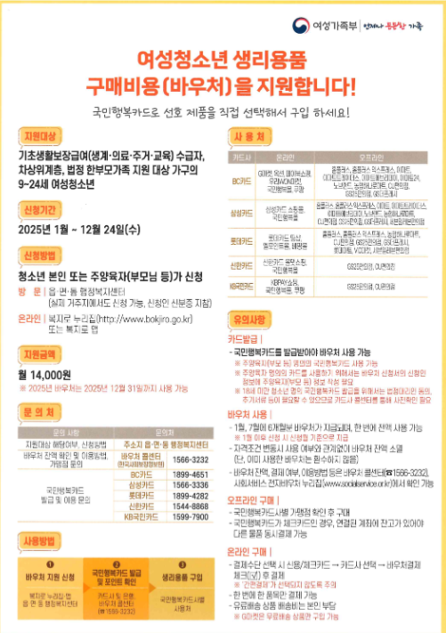 지원 대상은 9세부터 24세(2000년 1월 1일~2016년 12월 31일 출생자) 여성 청소년이며, 국민행복카드를 통해 월 14,000원 상당의 포인트가 지급된다. 이 포인트는 생리대, 탐폰 등 필수 생리용품 구입에 사용할 수 있다.