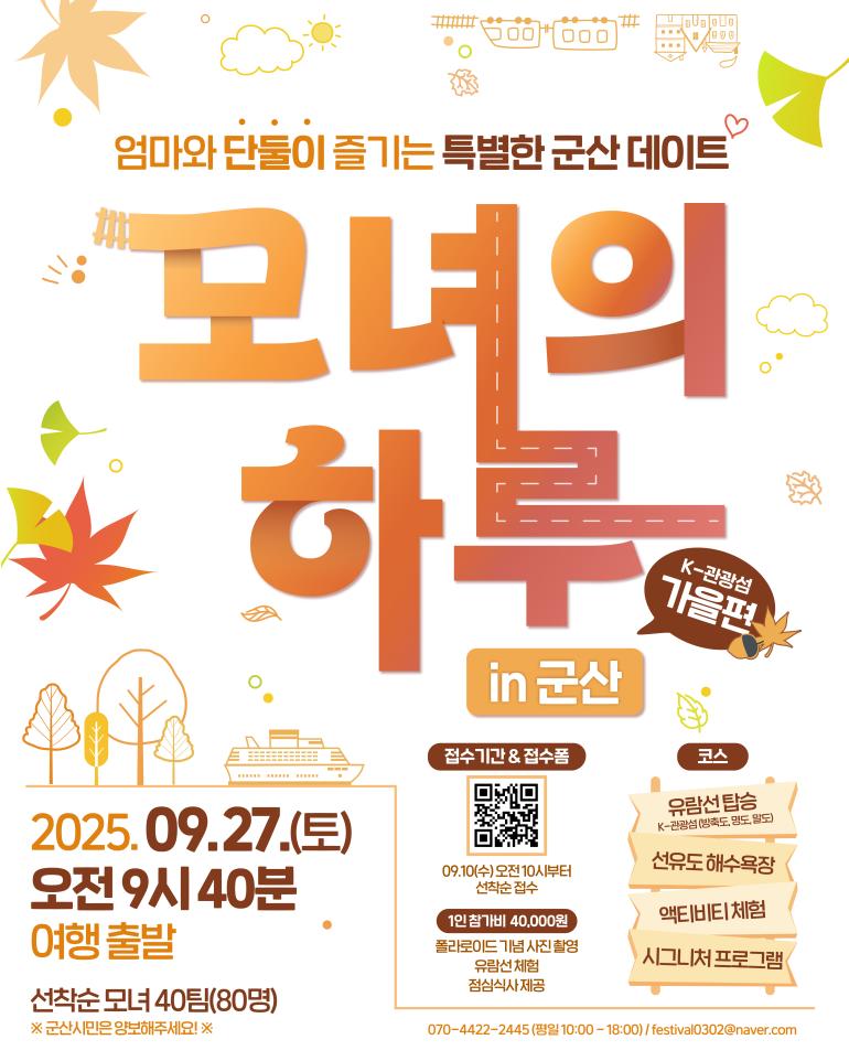 군산시가 대표 관광상품으로 자리 잡은 ‘모녀의 하루 in 군산’ 가을편 2회차 참가자를 10일 오전 10시부터 선착순 모집한다. 오는 27일에 열리는 이번 행사는 1회차 뜨거운 호응에 힘입어 참여 인원을 40팀(80명)으로 확대 모집한다. 이번 여행은 고군산군도의 푸른 섬과 K-관광섬 탐방, 감성 체험·편지쓰기 프로그램 등으로 구성돼 전국 모녀 관광객들의 마음을 사로잡을 예정이다.