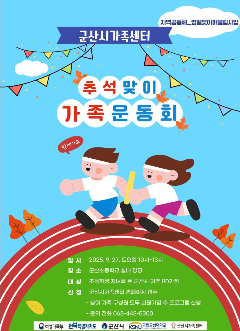 군산시가족센터(센터장 조경신)는 오는 27일, 추석을 맞아 다문화 및 비 다문화 가족 80가정, 약 230여 명이 참여하는 ‘추석맞이 가족 명랑운동회’를 군산초등학교 강당에서 개최한다.