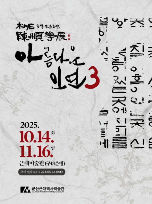 군산근대미술관이 10월 14일부터 11월 16일까지 송석 진순화 작가 초대전 『아름다운 인연3』을 연다. 이번 전시는 송석 진순화 작가가 오랜 시간 작업해 온 다양한 서화 작품의 결실을 한자리에 모은 자리로, 6폭 병풍, 전통 문틀, 족자 등 전통적 물건에 한글, 한자, 문인화 요소를 조화롭게 더한 작품 30여 점이 전시된다.