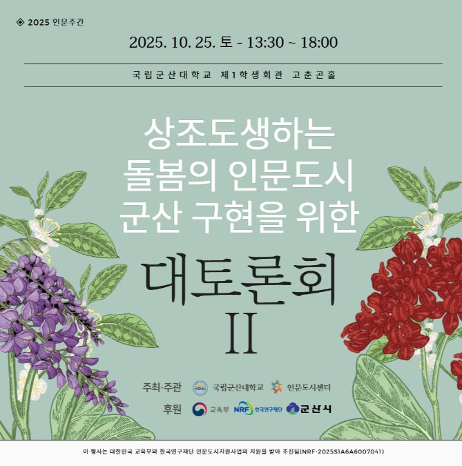 국립군산대학교 인문도시센터 오는 17일부터 다음 달 15일까지 2025년 제20회 인문주간 행사를 국립군산대학교 미룡동 캠퍼스를 비롯해 군산시 곳곳에서 개최한다고 15일 밝혔다.