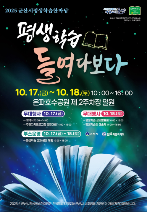 배움이 일상이 되는 도시 ‘군산’이 시민 주도의 배움 축제 ‘2025 군산시 평생학습한마당’을 오는 17일부터 18일까지 이틀간 은파호수공원 제2주차장에서 ‘개최한다. 올해는 ‘평생학습, 들여다보다’를 주제로, 무대 공연과 체험 프로그램 등 다채로운 행사가 시민과 함께 펼쳐질 예정이다.