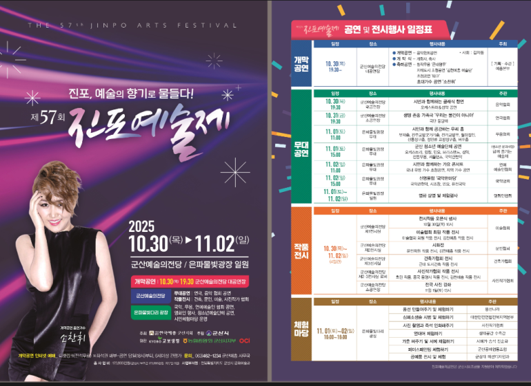 지역 예술계의 다양한 창작활동을 만날 수 있는 제57회 진포예술제가 ‘진포! 예술의 향기’라는 주제로 30일부터 11월 2일까지 4일간 군산예술의전당과 은파호수공원 일원에서 열린다.