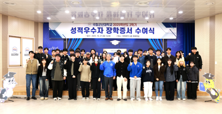 국립군산대학교는 지난 27일 대학본부 대회의실에서 ‘2025학년도 2학기 성적우수자 장학증서 수여식’을 개최했다고 28일 밝혔다. 이번 행사는 장학생들의 노력과 성취를 격려하고, 학생들과의 자유로운 소통의 기회를 위해 마련됐다.
