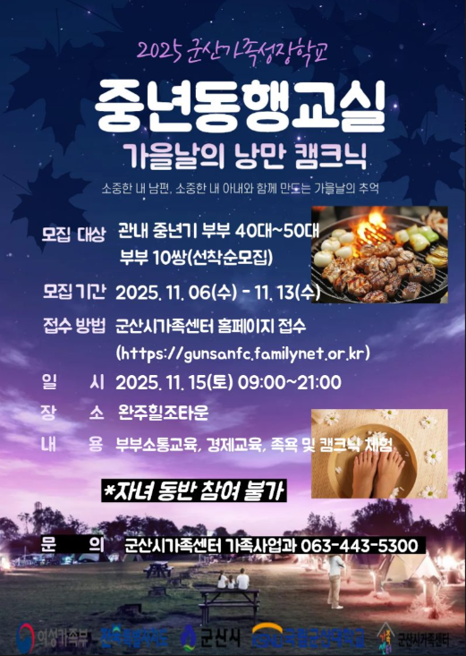 국립군산대학교 산학협력단이 수탁 운영하는 군산시가족센터(센터장 조경신)가 오는 15일(토), 중년기 부부를 대상으로 소통과 힐링을 주제로 한 부부공감 프로그램 ‘2025 군산가족성장학교 중년동행교실’을 운영한다.