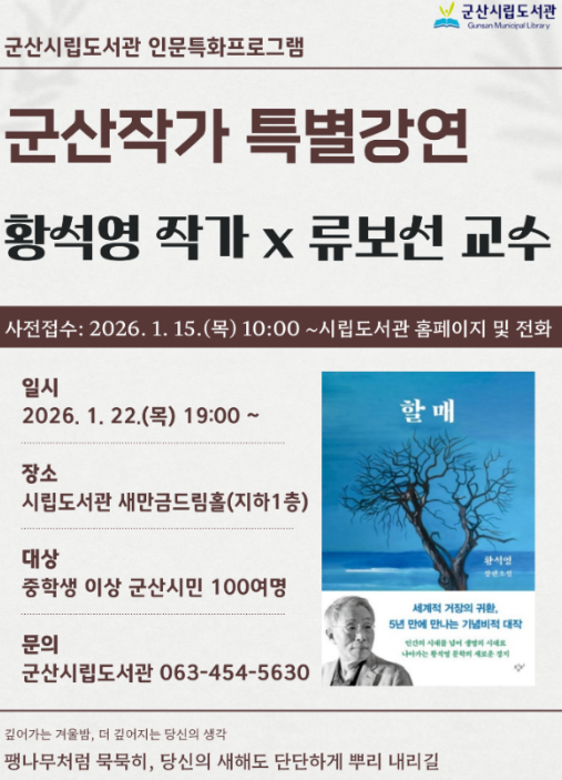 군산시립도서관 관계자는 “이번 강연은 작가와 시민이 직접 소통하며 문학을 매개로 생각을 나누는 자리”라며 “지역성과 인문적 가치를 함께 조명하는 의미 있는 시간이 될 것”이라고 말했다.