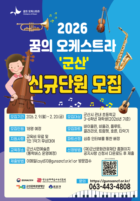선발된 단원은 3월부터 11월까지 매주 군산시민예술촌에서 교육을 받으며, 악기 무상 대여를 포함해 여름 예술 학교, 정기 공연 등 모든 비용이 전액 지원된다. 접수는 재단 홈페이지(gunsancf.or.kr)를 통해 가능하다.