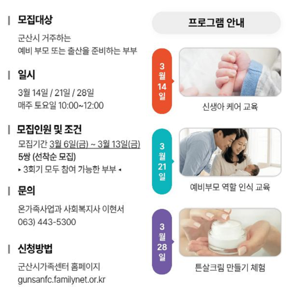 국립군산대학교 산학협력단이 수탁 운영하는 이번 프로그램은 임신을 준비 중이거나 출산을 앞둔 예비부모를 대상으로 한다. 부모 역할에 대한 올바른 이해를 높이고, 실제 양육에 필요한 지식과 체험 기회를 제공하기 위해 마련됐다.