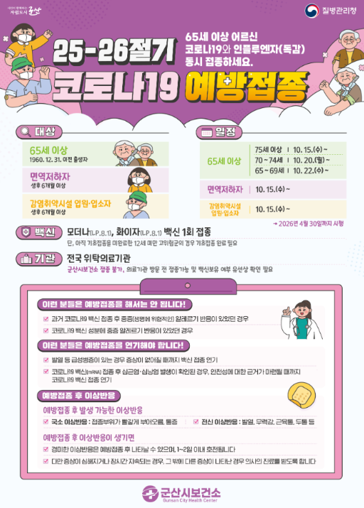 군산시는 오는 10월 15일부터 내년 4월까지 인플루엔자 및 코로나19 예방접종을 순차적으로 실시한다. 예방접종은 ▲10월 15일부터 75세 이상 ▲10월 20일부터 70~74세 ▲10월 22일부터 65~69세 연령대별로 순차적으로 실시한다.