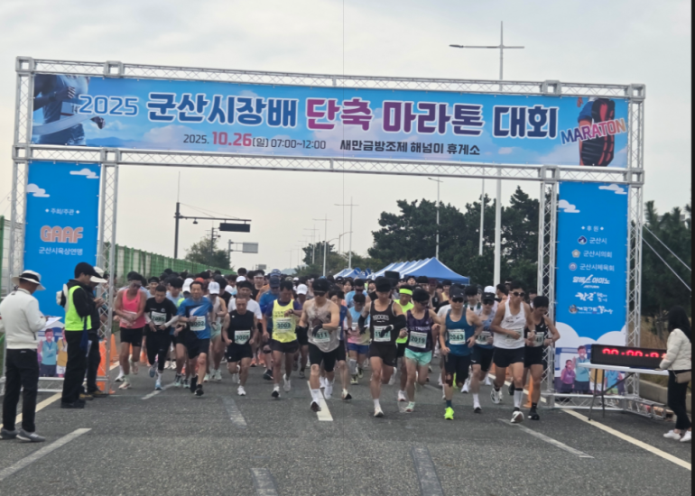 군산시육상연맹(회장 송공섭)은 지난 26일 새만금방조제 해넘이 휴게소 하부도로에서 ‘2025 군산시장배 단축마라톤대회’를 성황리에 개최했다.이번 대회는 마라톤 저변 확대와 생활체육 활성화를 위해 매년 열리는 행사로, 올해는 도내 학생과 동호인 700여 명이 참가해 뜨거운 열기를 더했다.