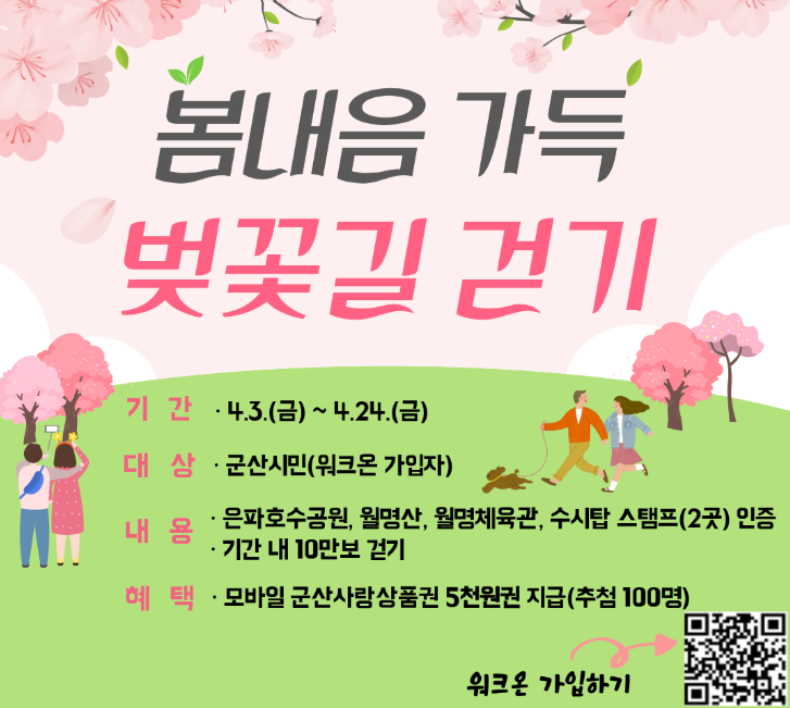 군산시보건소가 봄철 시민들의 건강한 생활습관 형성과 신체활동 촉진을 위해 오는 4월 3일부터 24일까지 ‘봄내음 가득, 벚꽃길 걷기’ 챌린지를 운영한다.